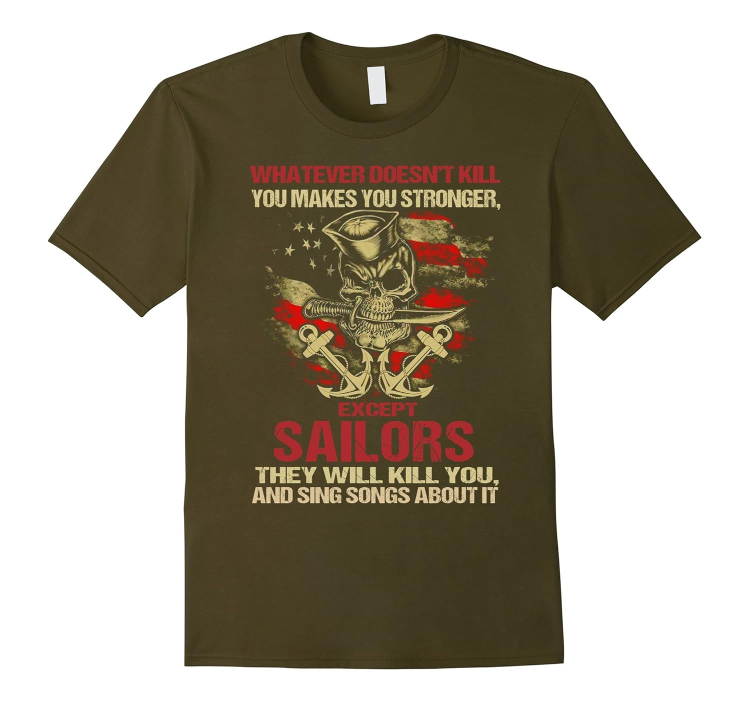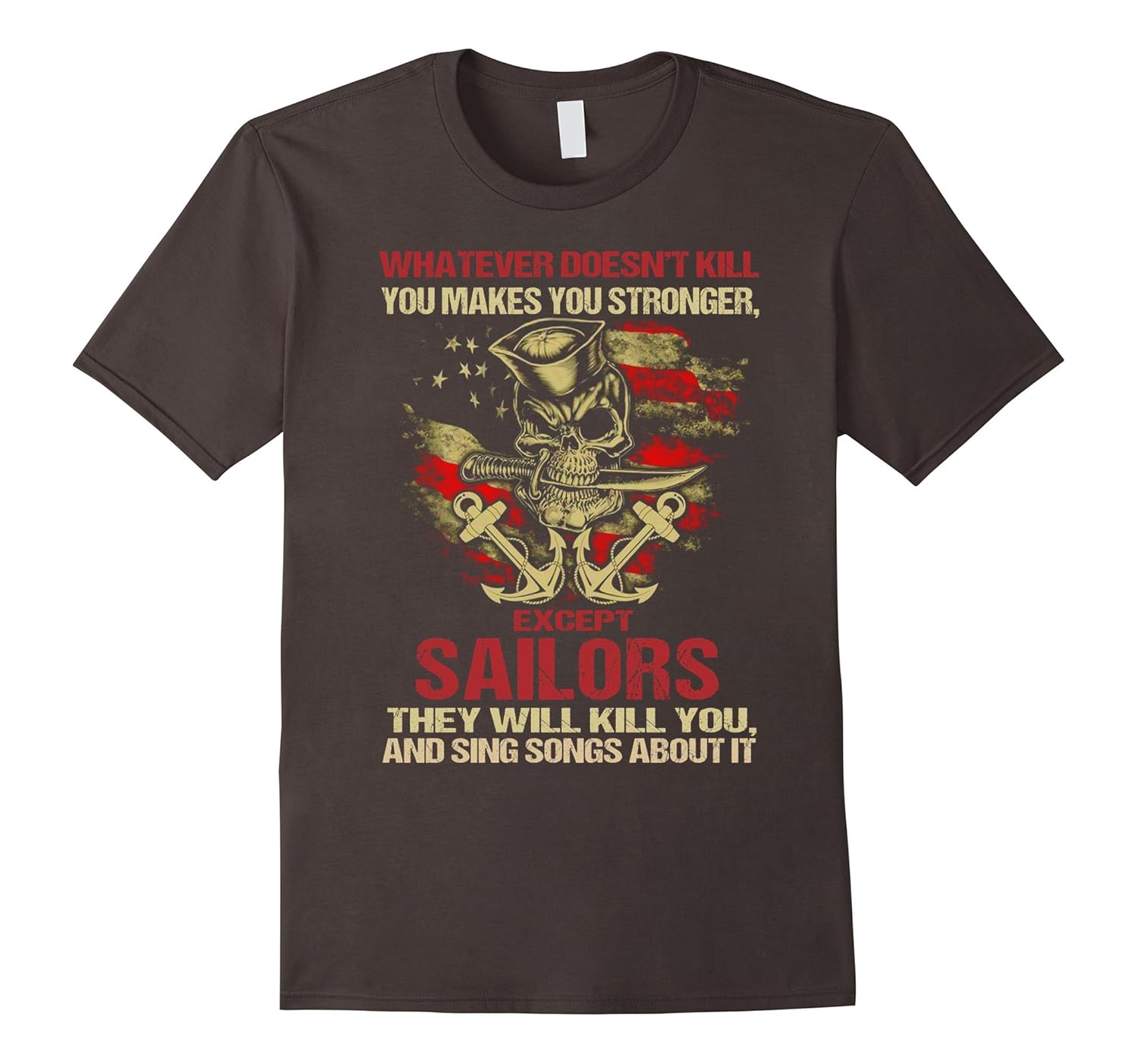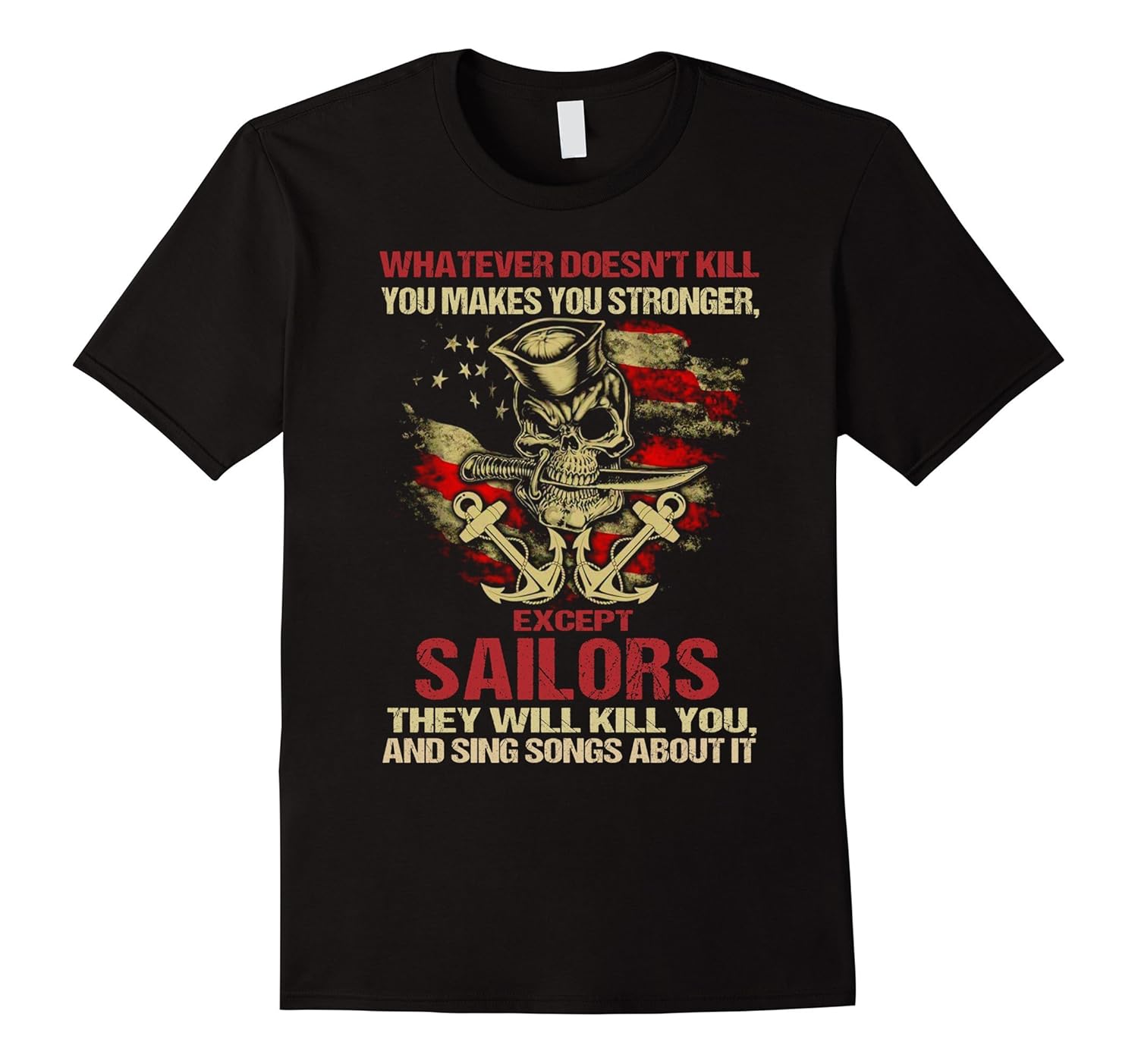Solid colors: 100% Cotton; Heather Grey: 90% Cotton, 10% Polyester; All Other Heathers: 65% Cotton, 35% Polyester, Imported, Machine wash cold with like colors, dry low heat, Whatever Doesn”t Kill You Makes You Stronger Funny Sailors T-Shirt, Whatever Doesn”t Kill You Makes You Stronger Except Sailors They Will Kill You And Sing Songs About It Shirt, Lightweight, Classic fit, Double-needle sleeve and bottom hem