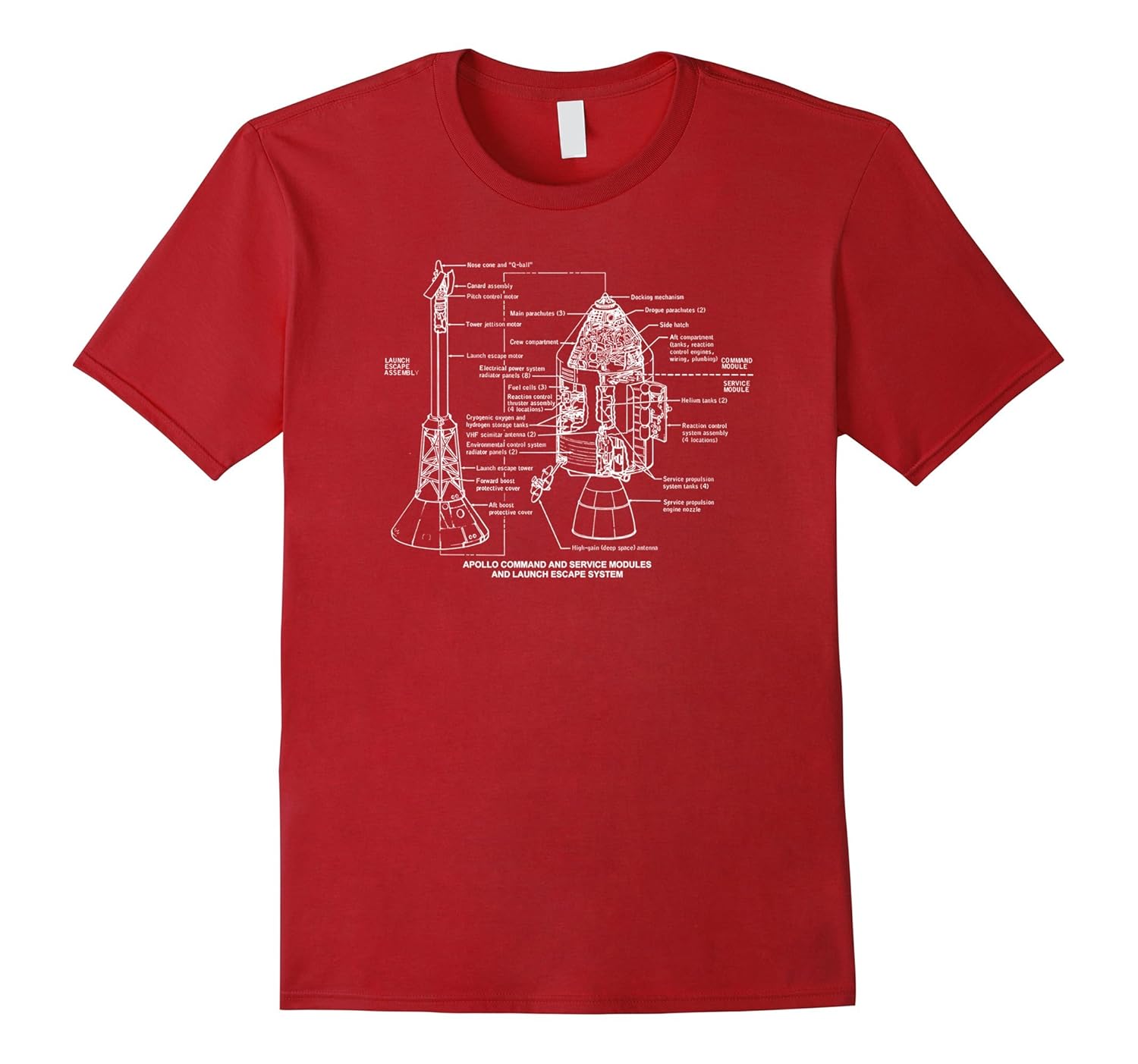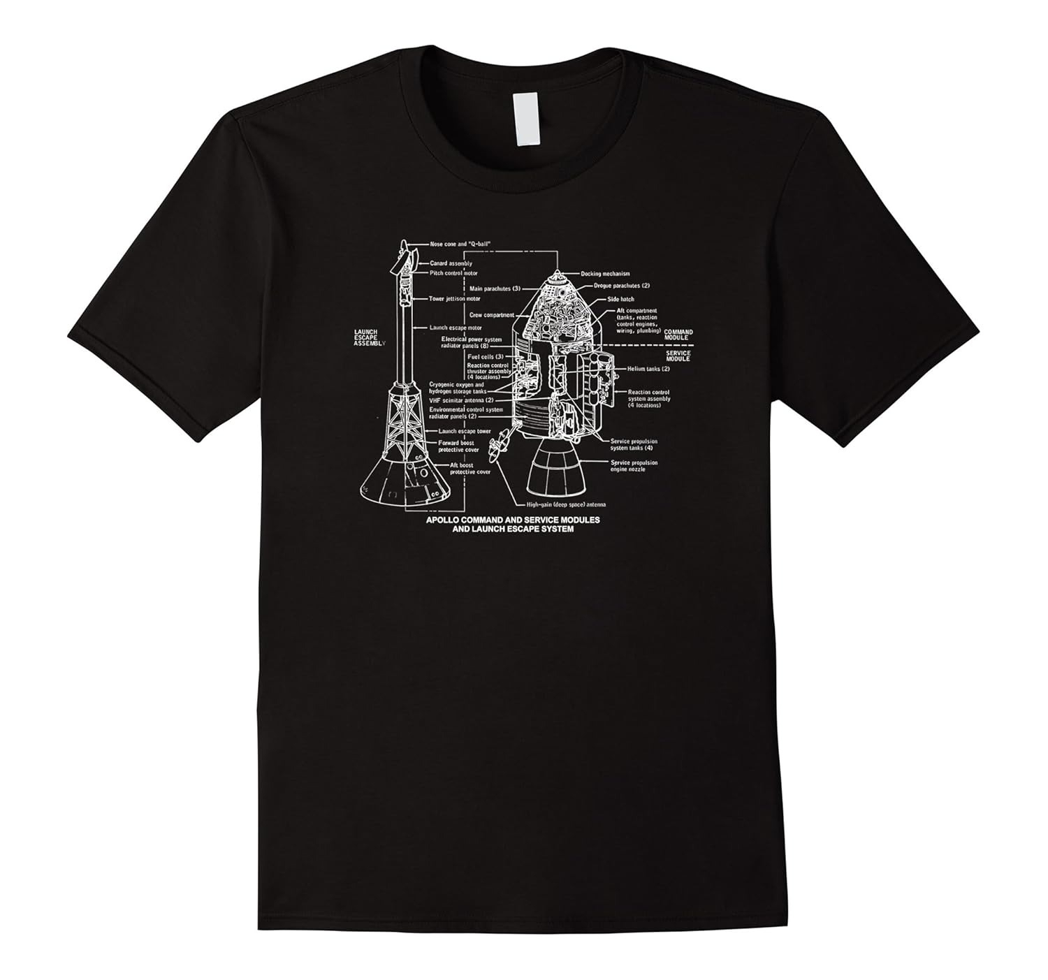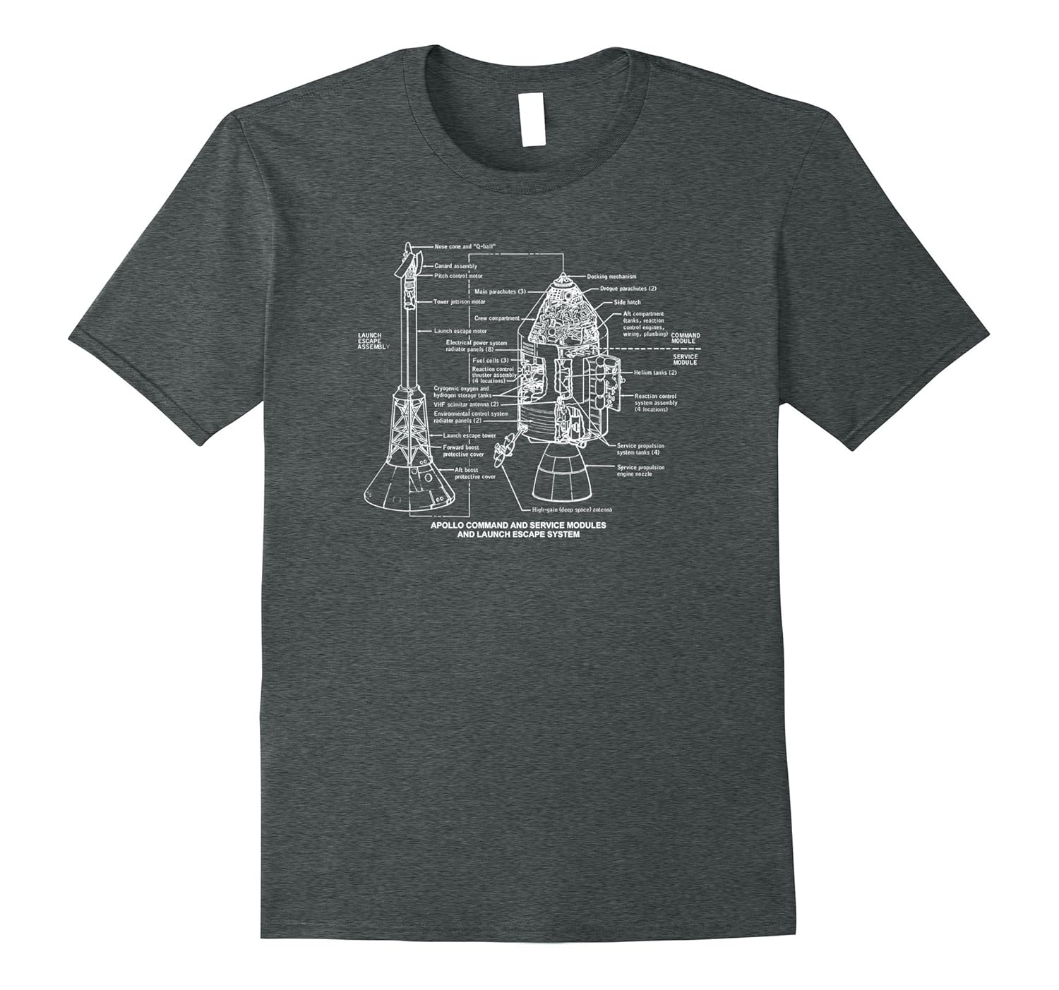 Solid colors: 100% Cotton; Heather Grey: 90% Cotton, 10% Polyester; All Other Heathers: 65% Cotton, 35% Polyester, Imported, Machine wash cold with like colors, dry low heat, Apollo 11 Command and Service Module and Launch Escape System Schematics, Schematics and cutaways of the Apollo Mission Rocket Command and Service Modules Used in the Moon Landing, Lightweight, Classic fit, Double-needle sleeve and bottom hem