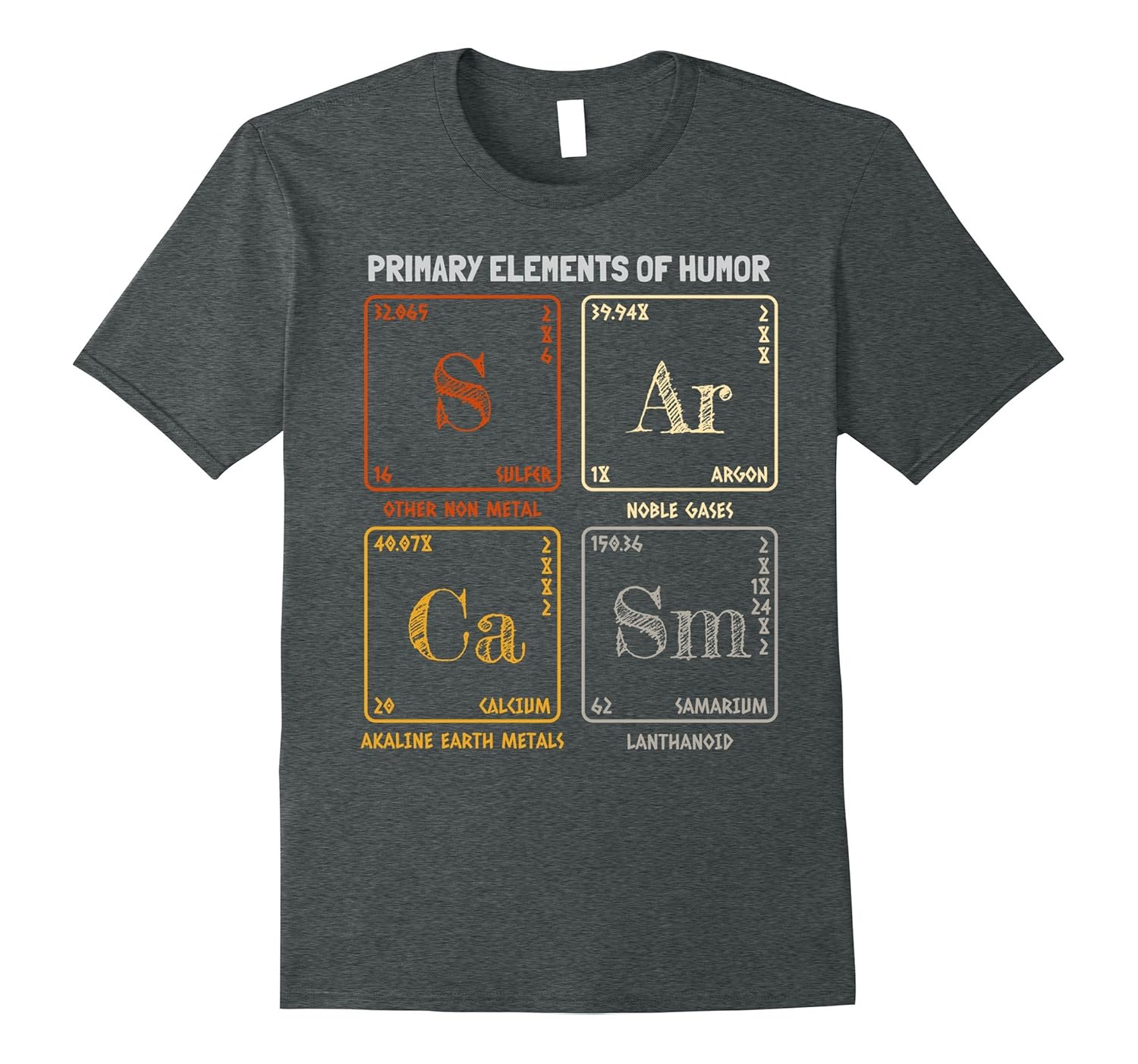 Solid colors: 100% Cotton; Heather Grey: 90% Cotton, 10% Polyester; All Other Heathers: 65% Cotton, 35% Polyester, Imported, Machine wash cold with like colors, dry low heat, Sarcasm Primary Elements Of Humor Funny Chemist T-Shirt Vintage, Lightweight, Classic fit, Double-needle sleeve and bottom hem